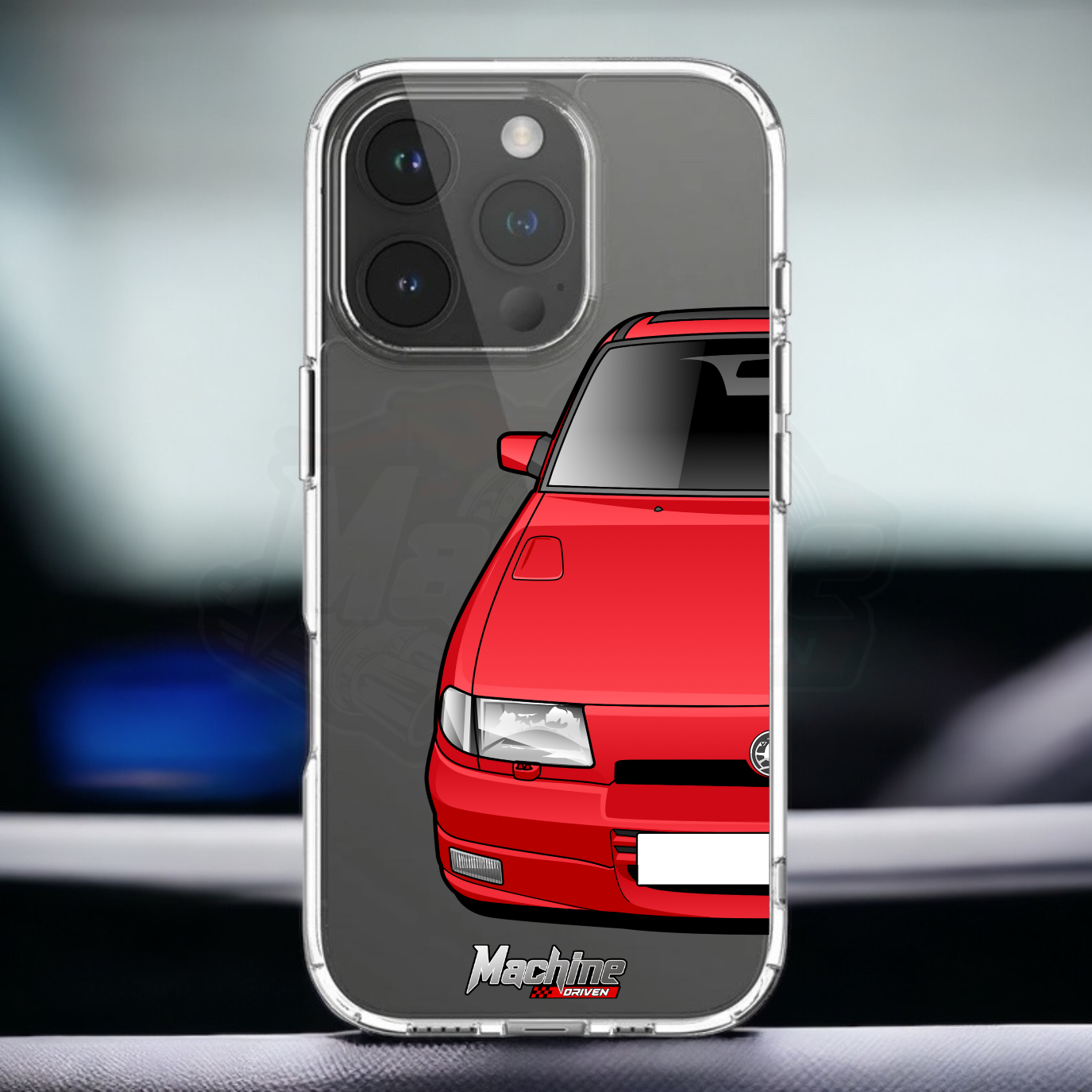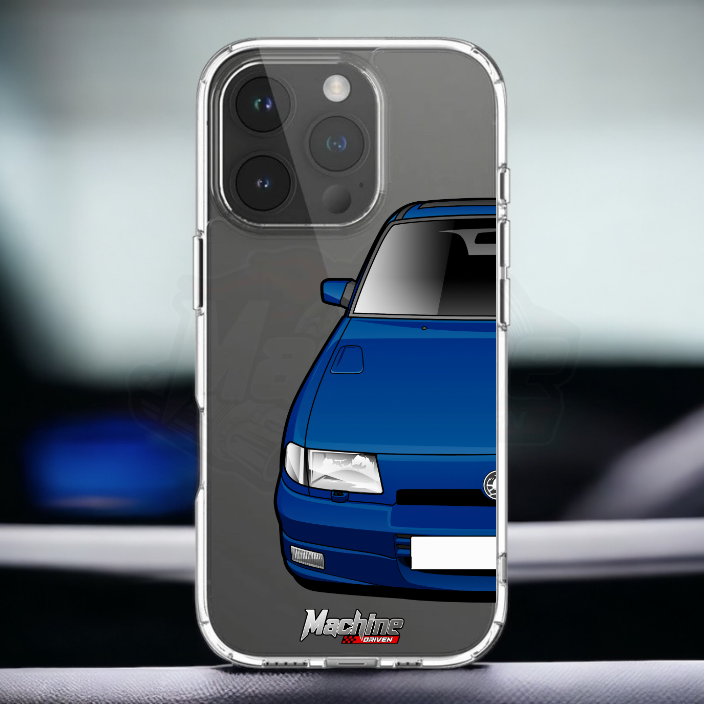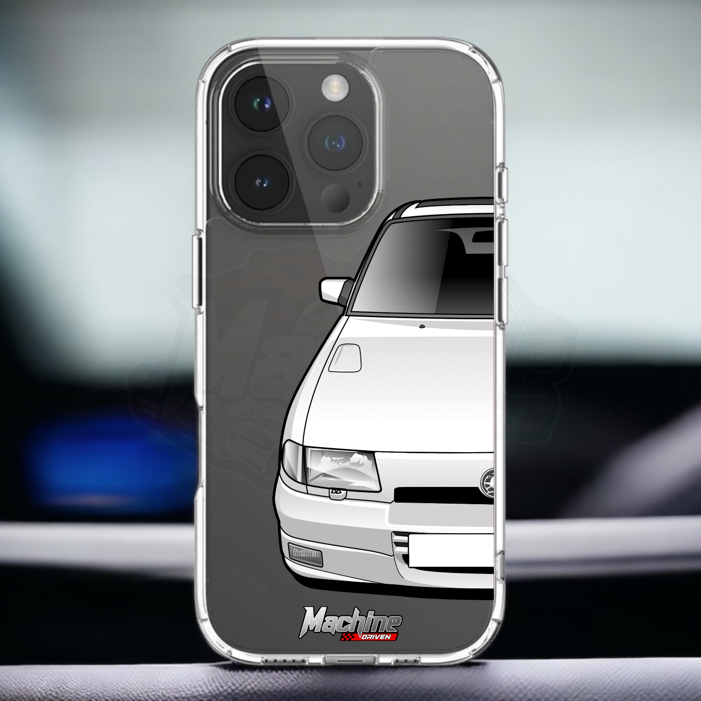Our phone cases are transparent to show off the original colour of your phone, overlayed with ultra realistic half-image of your car and Machine Driven Logo.