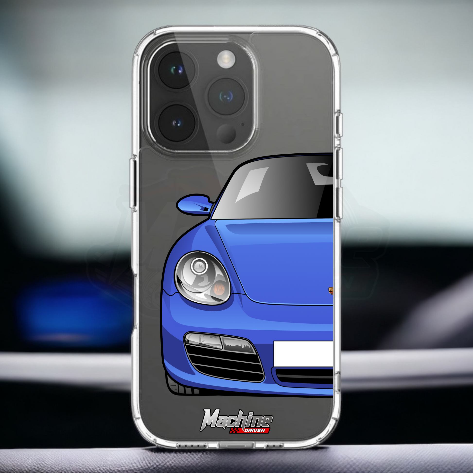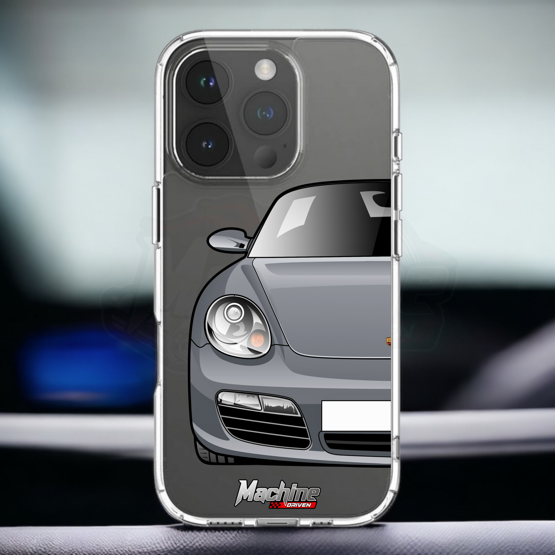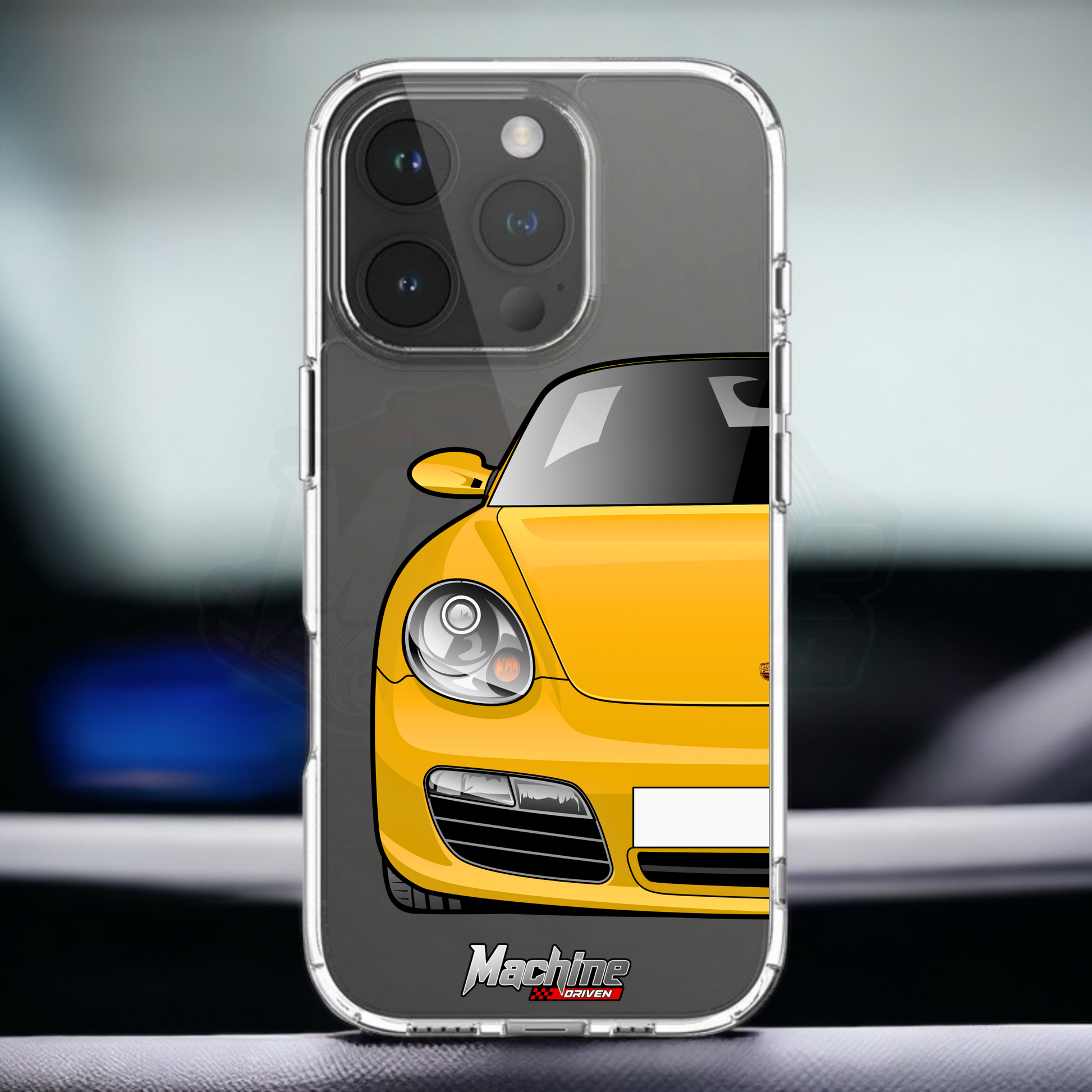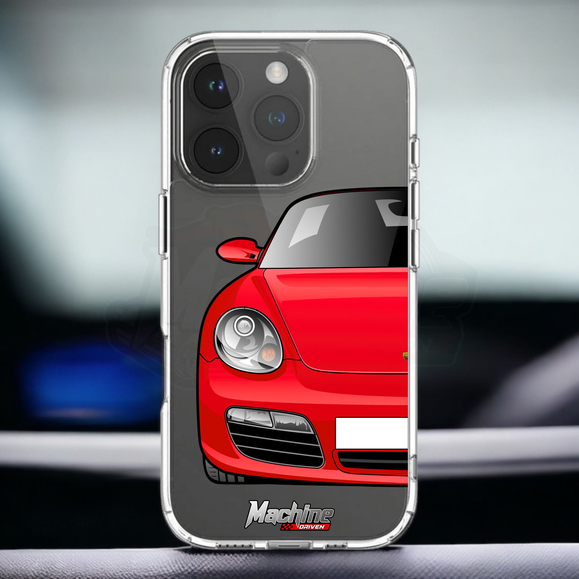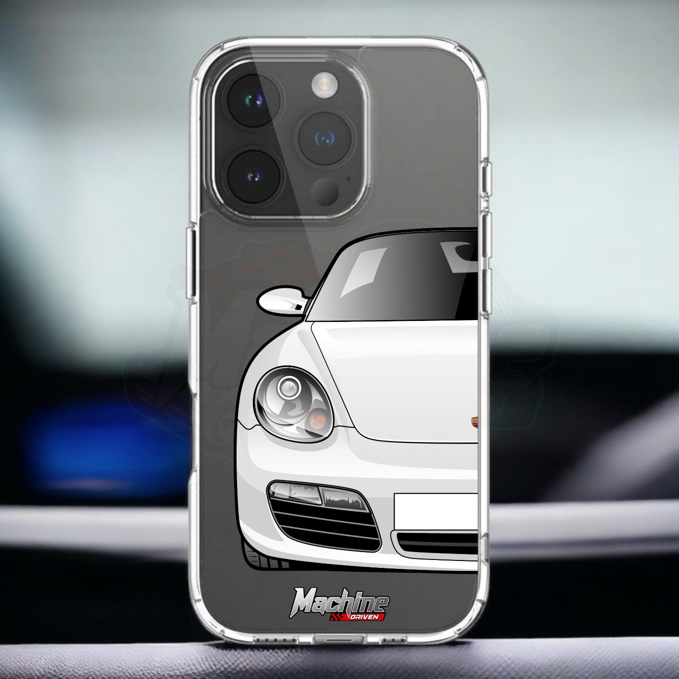 Our phone cases are transparent to show off the original colour of your phone, overlayed with ultra realistic half-image of your car and Machine Driven Logo.