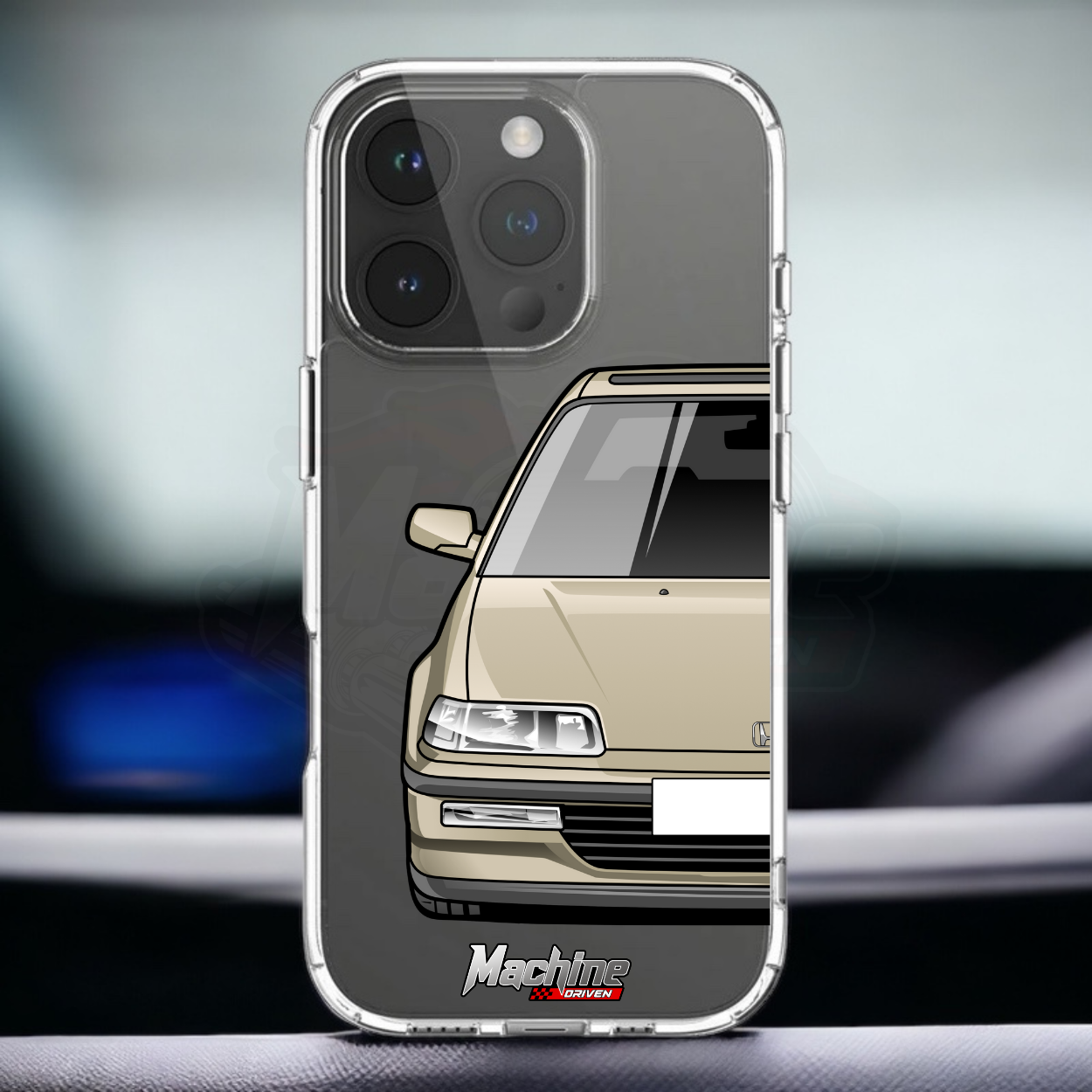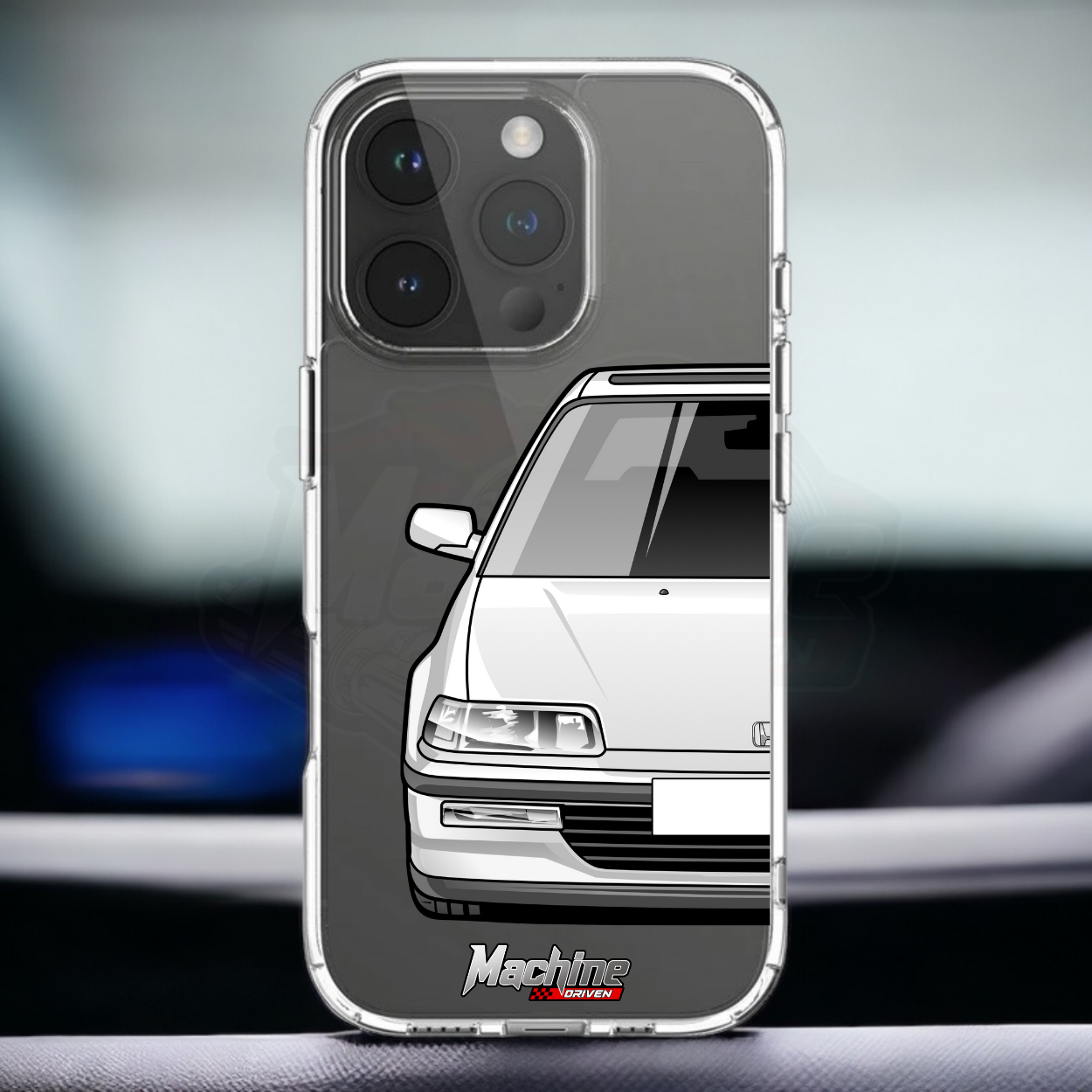 Our phone cases are transparent to show off the original colour of your phone, overlayed with ultra realistic half-image of your car and Machine Driven Logo.