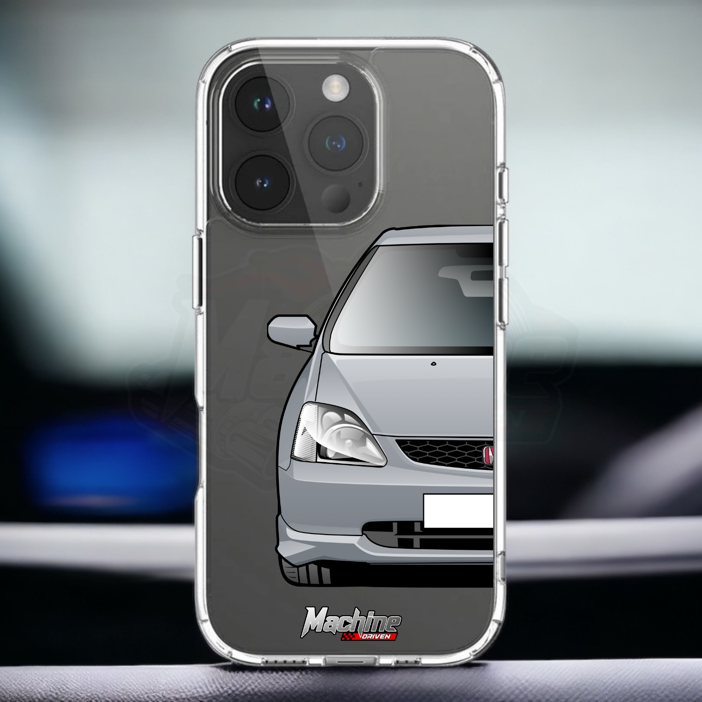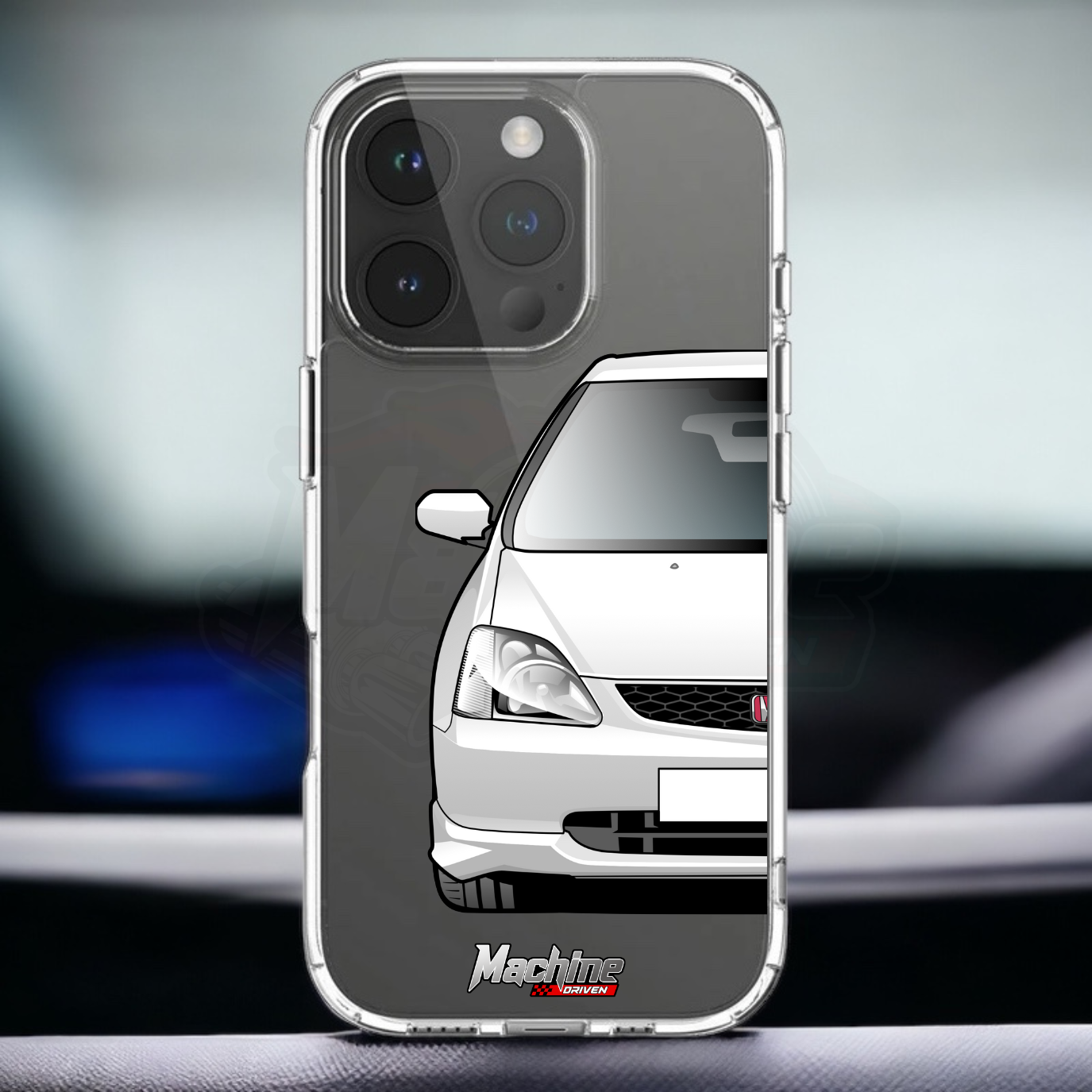 Our phone cases are transparent to show off the original colour of your phone, overlayed with ultra realistic half-image of your car and Machine Driven Logo.