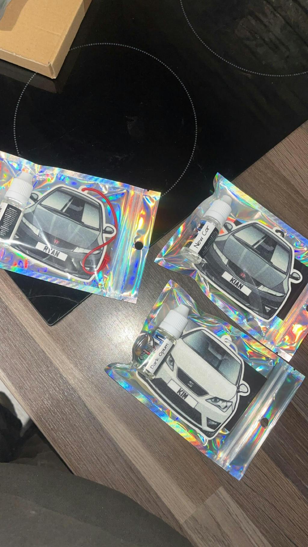 Each freshener comes with a 10ml bottle of your chosen fragrance. Before use, shake the bottle well and apply a few drops to the white border of your personalised freshener. Reapply as needed once the scent begins to fade.