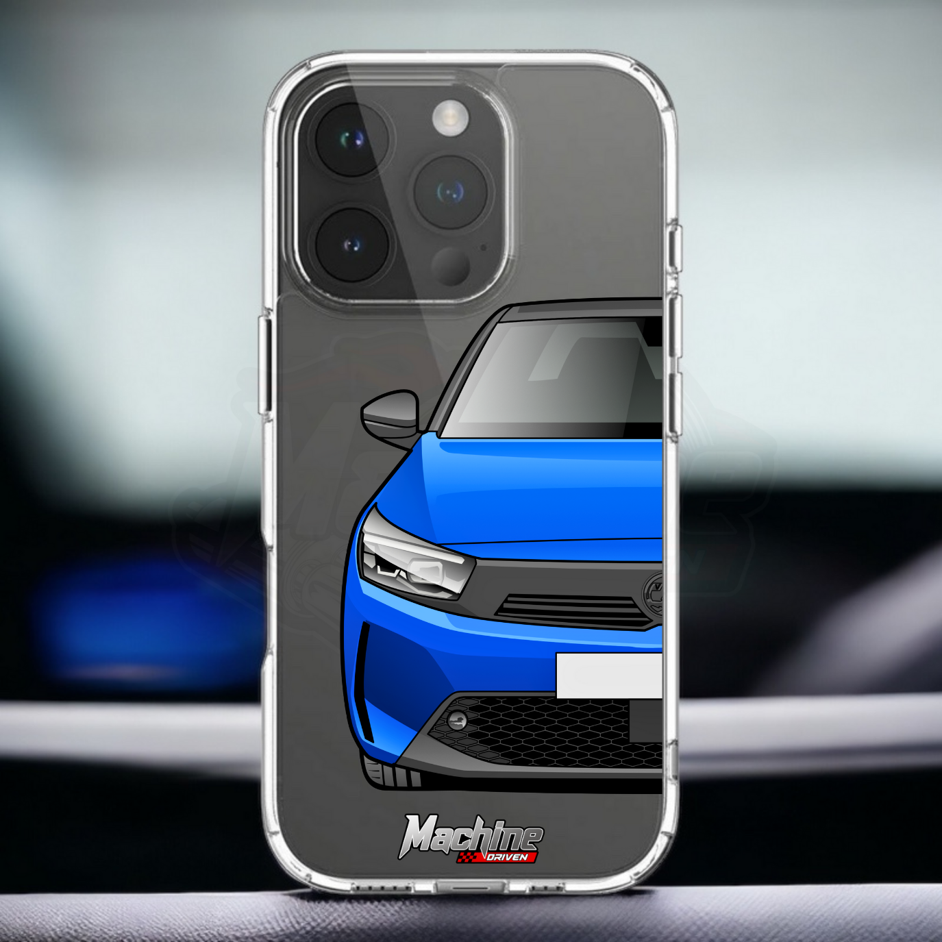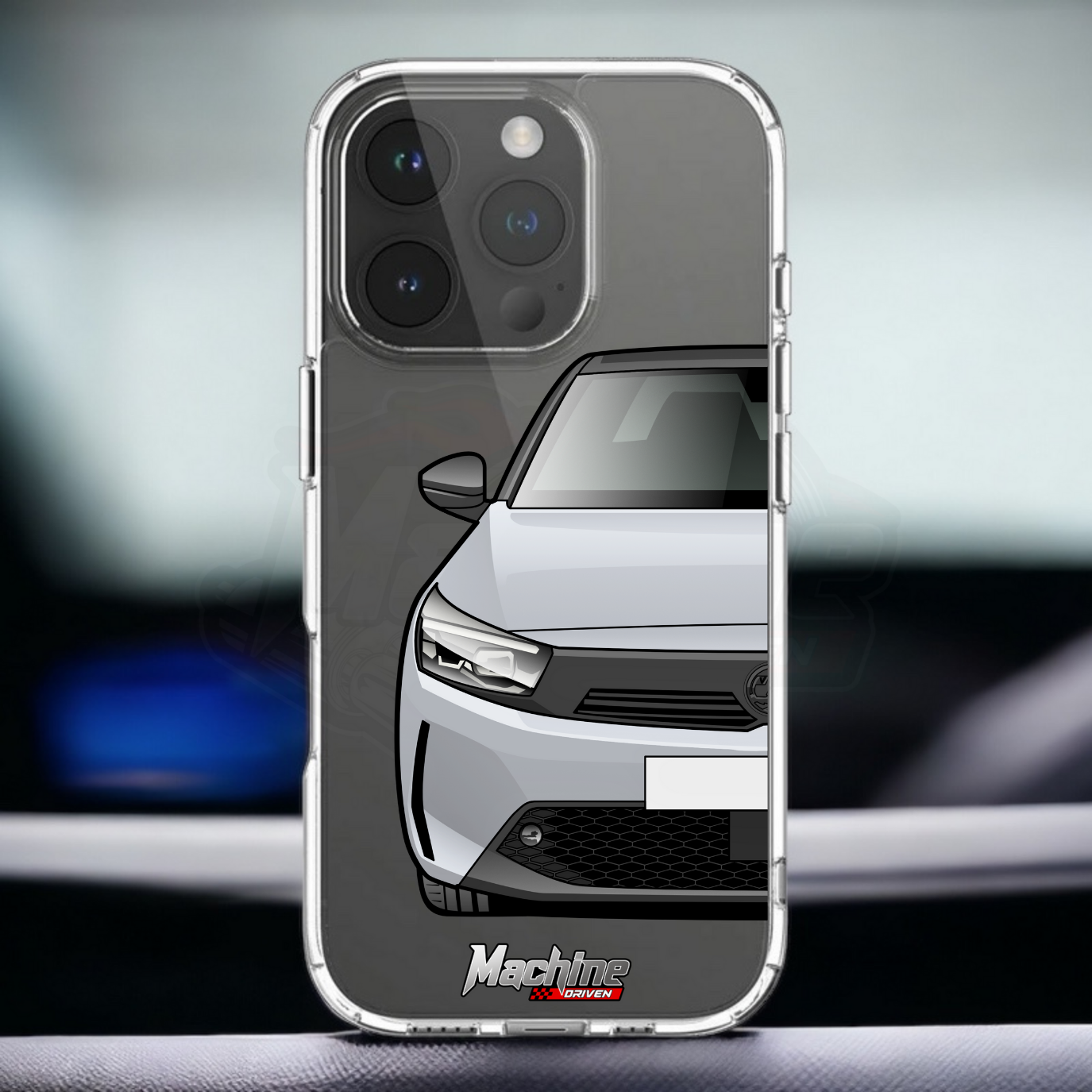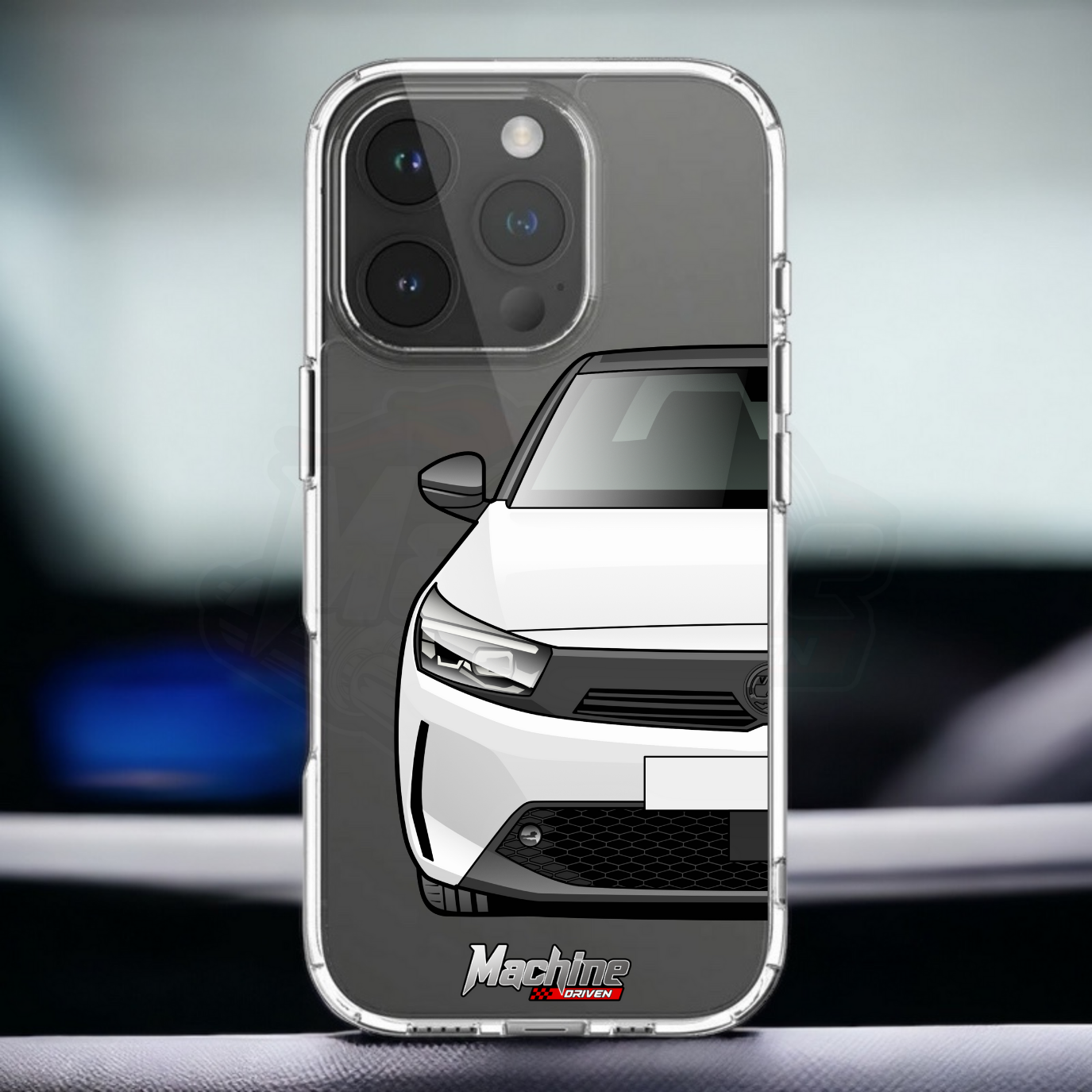 Our phone cases are transparent to show off the original colour of your phone, overlayed with ultra realistic half-image of your car and Machine Driven Logo.