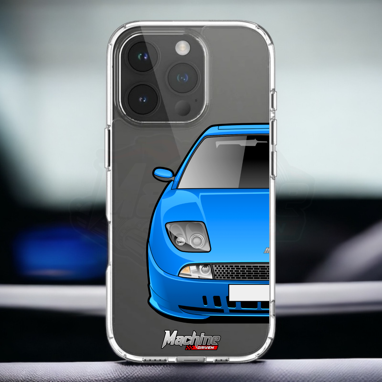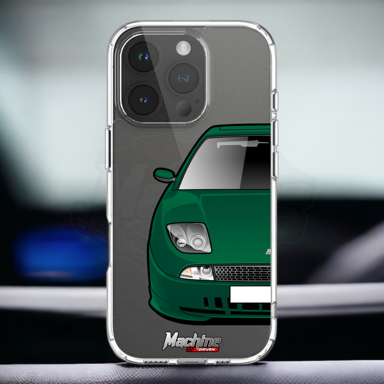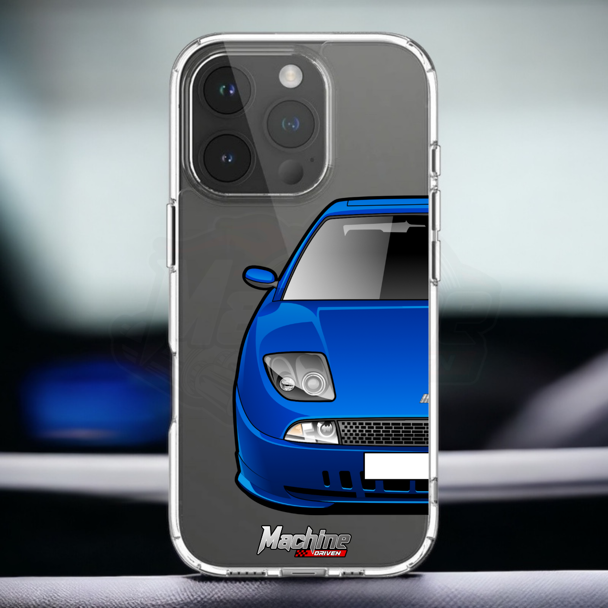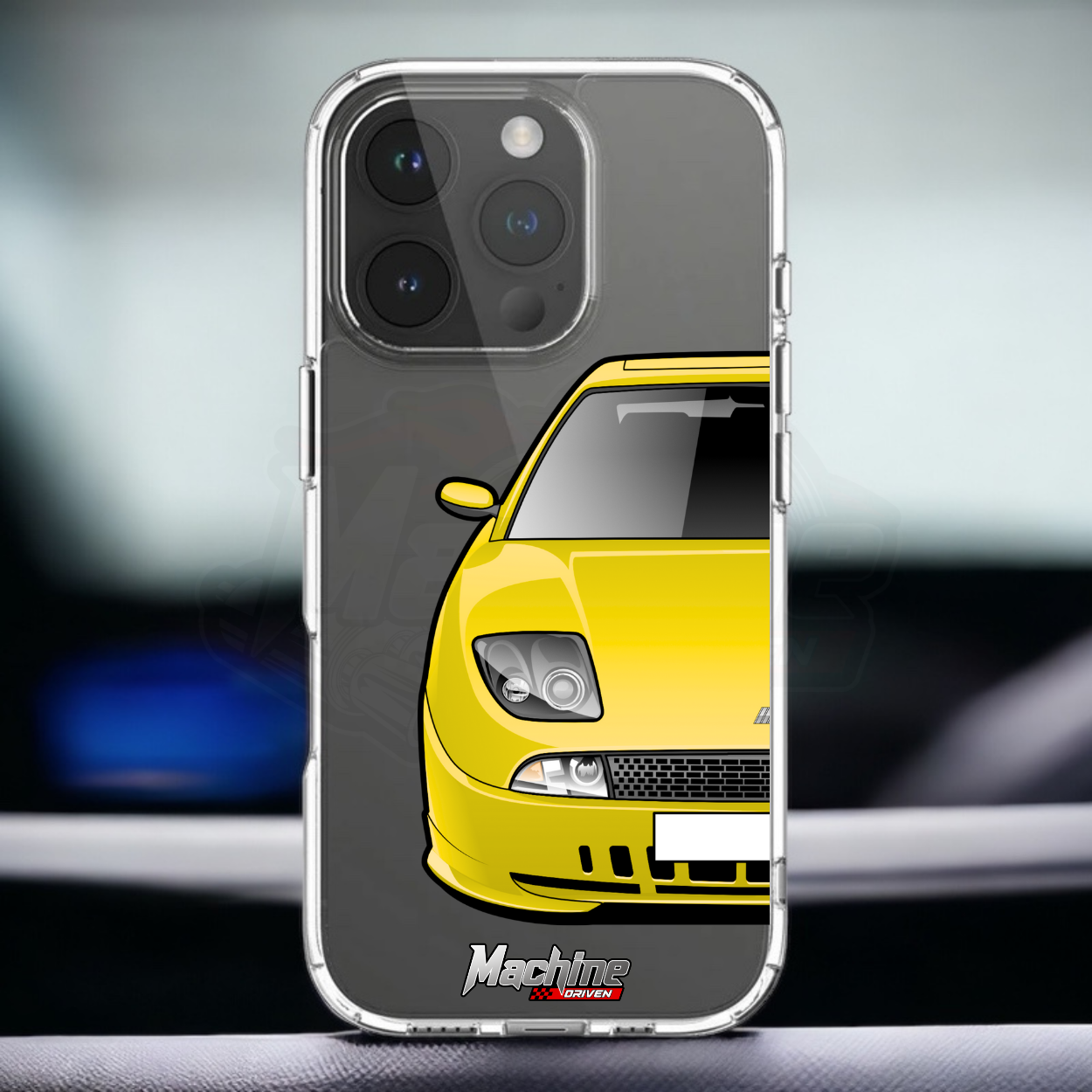 Our phone cases are transparent to show off the original colour of your phone, overlayed with ultra realistic half-image of your car and Machine Driven Logo.