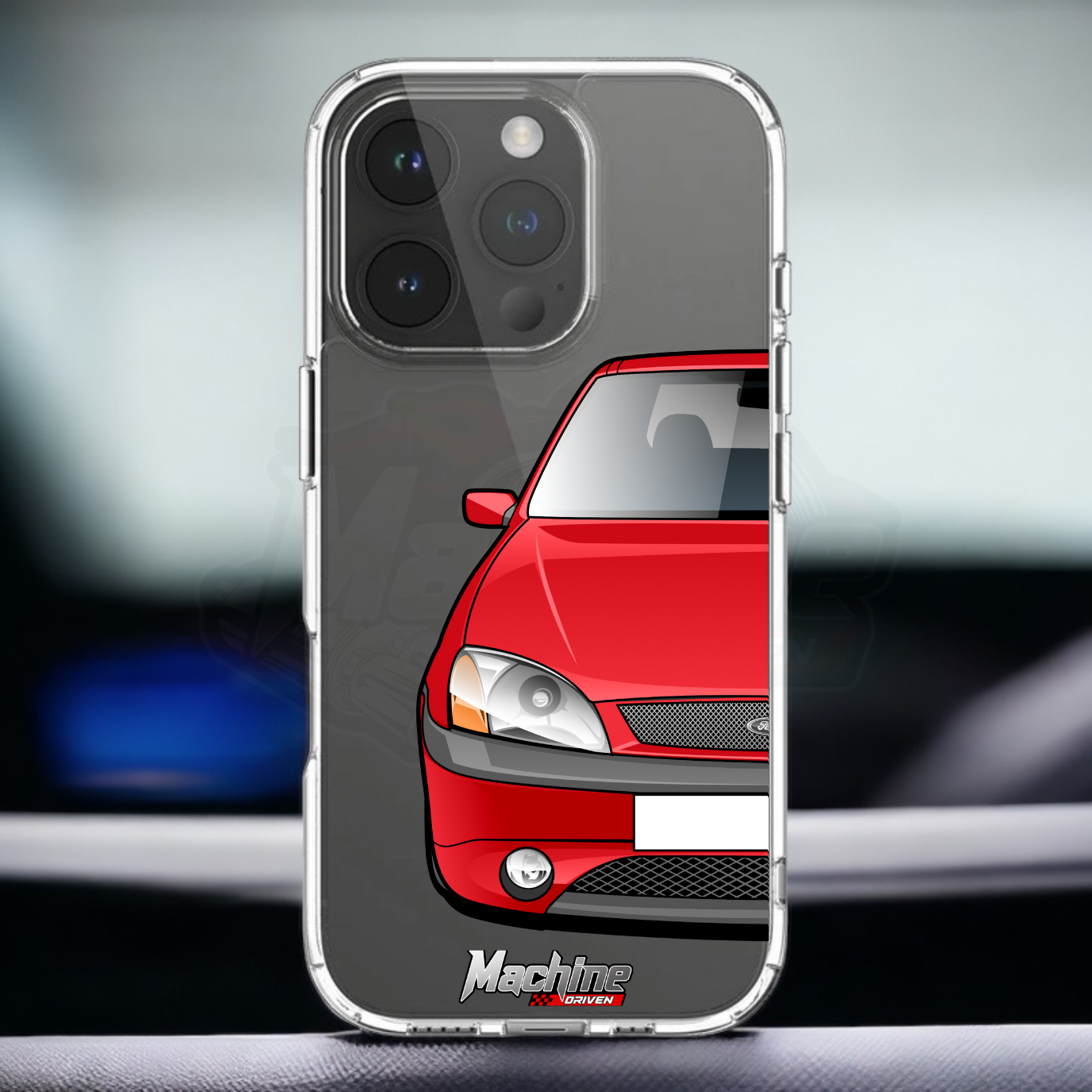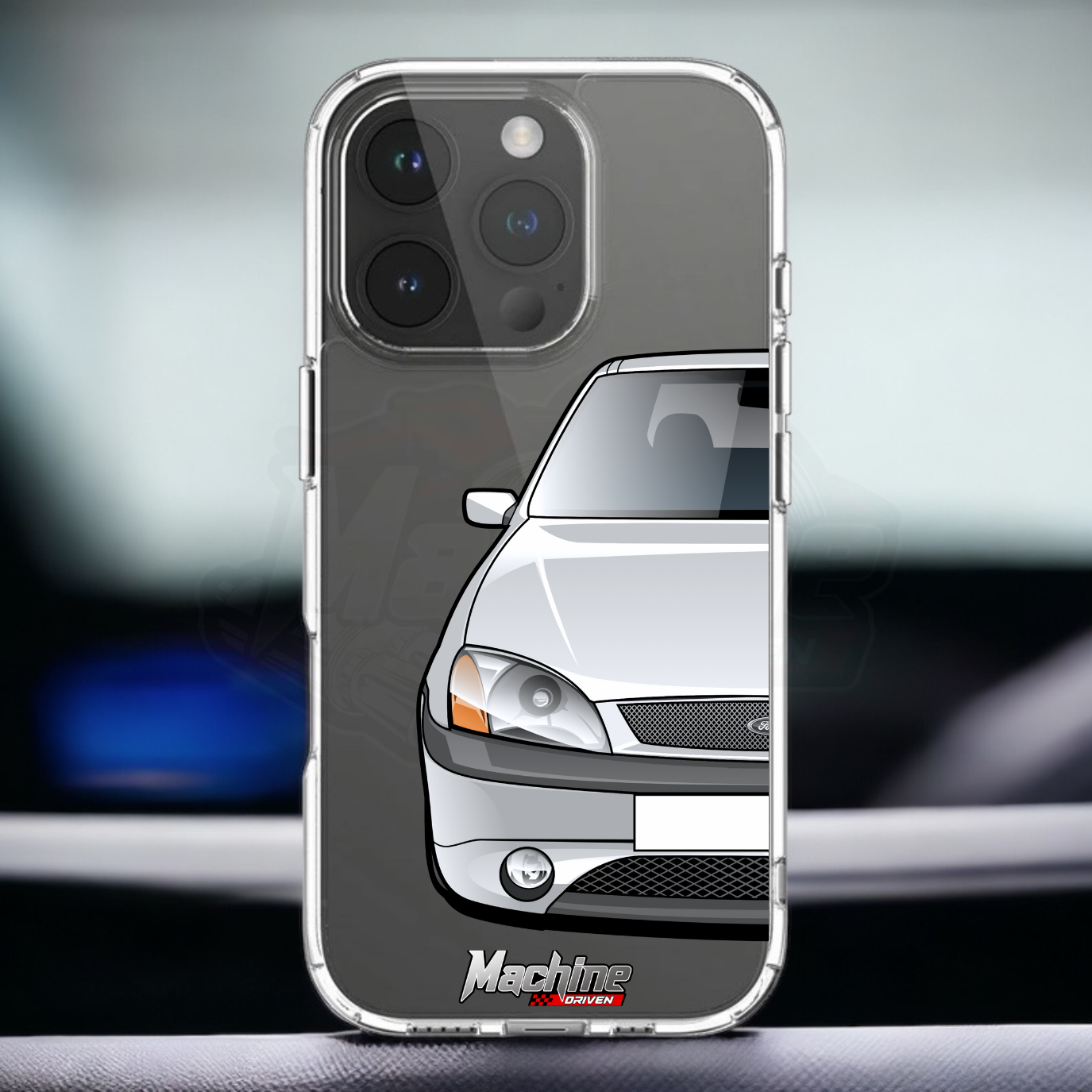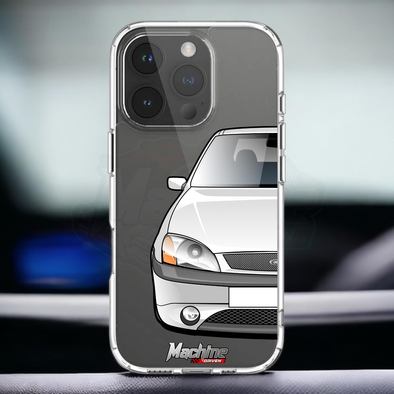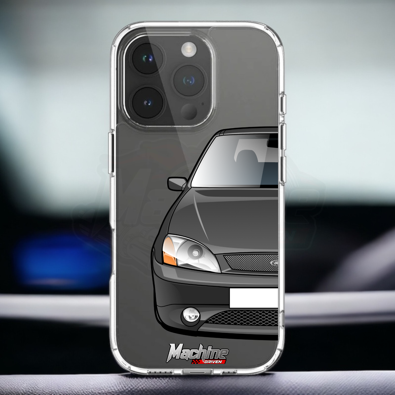 Our phone cases are transparent to show off the original colour of your phone, overlayed with ultra realistic half-image of your car and Machine Driven Logo.