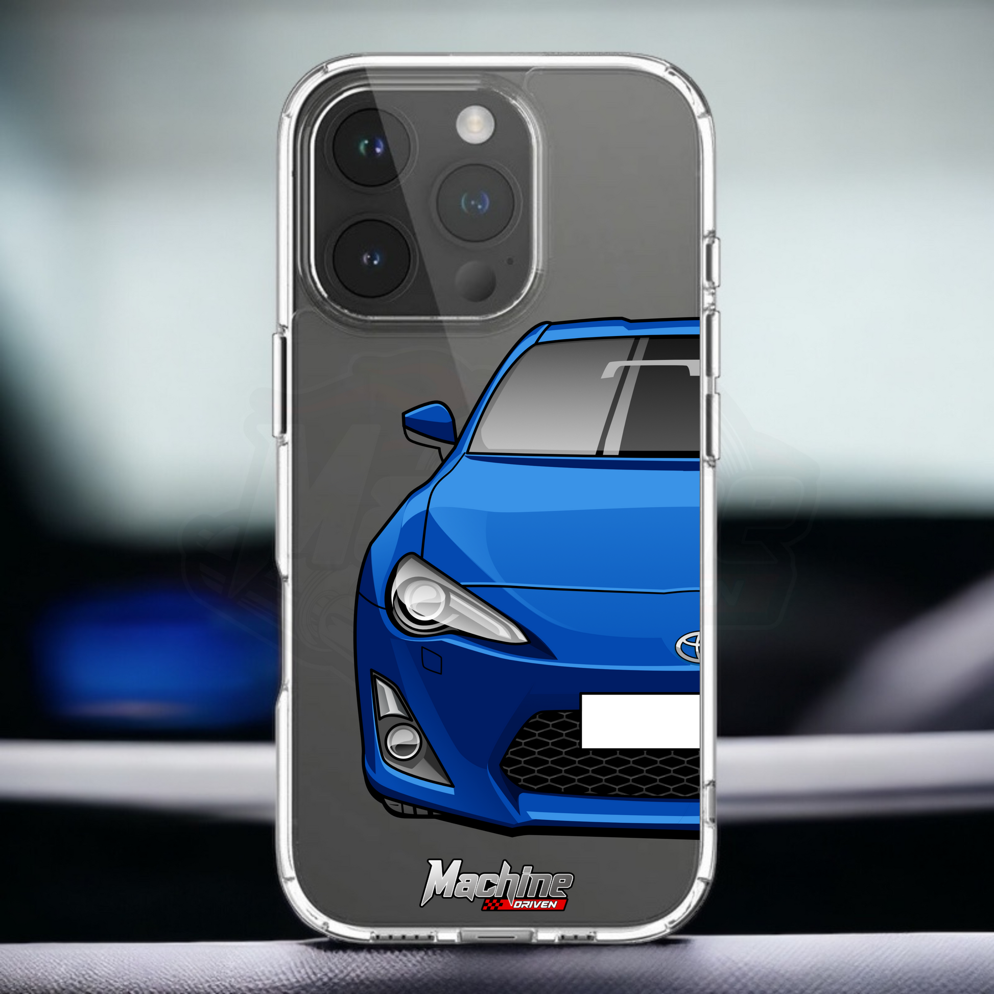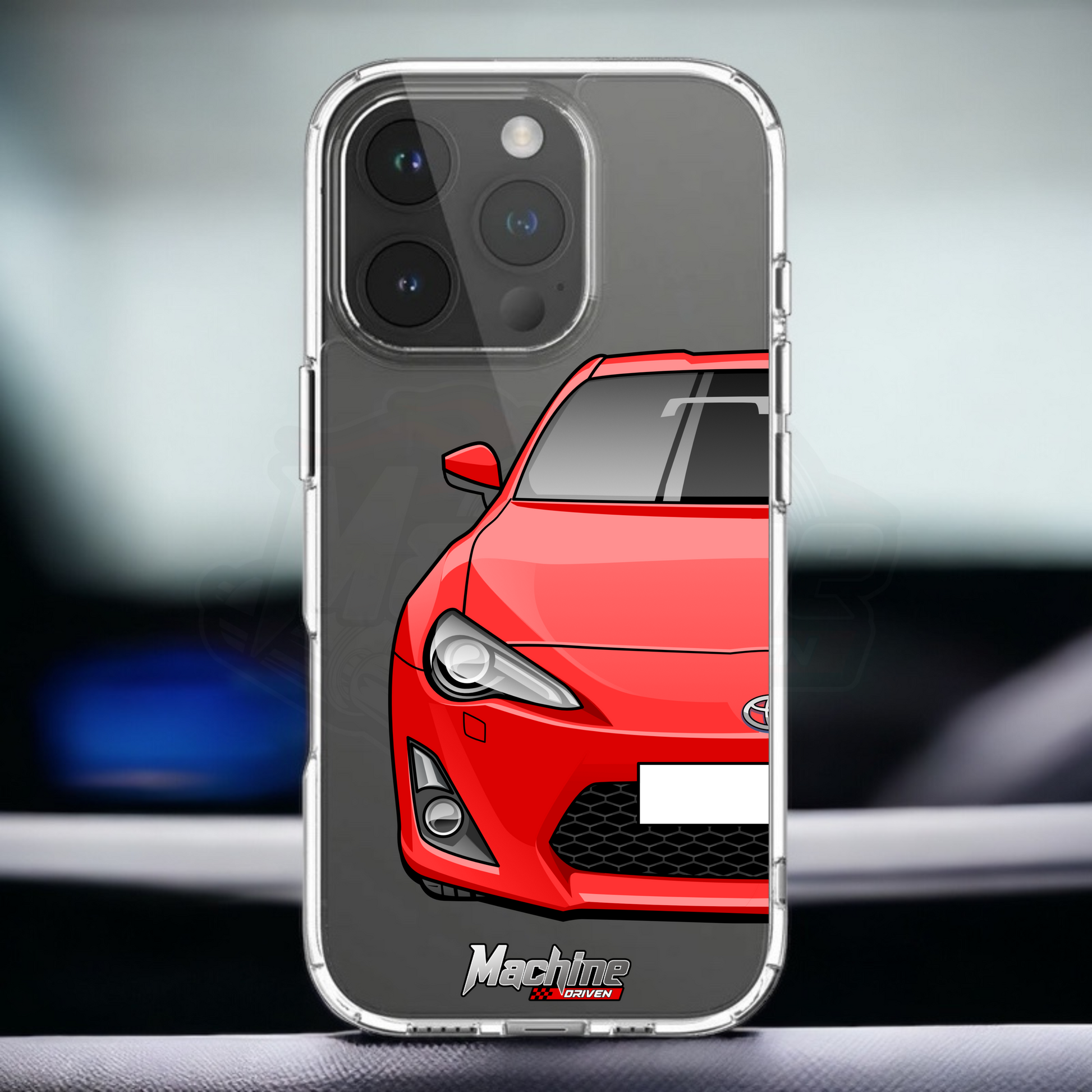 Our phone cases are transparent to show off the original colour of your phone, overlayed with ultra realistic half-image of your car and Machine Driven Logo.