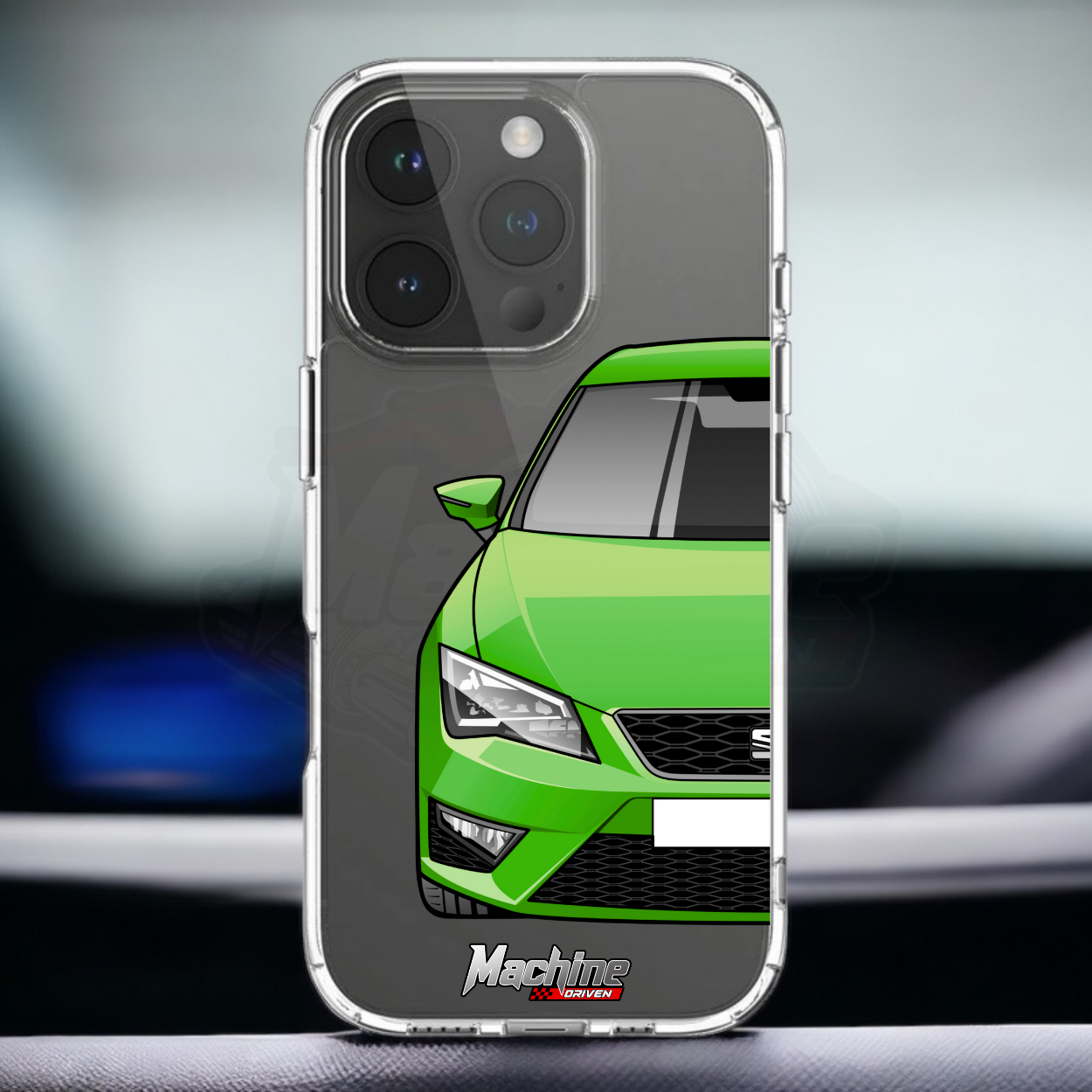 Our phone cases are transparent to show off the original colour of your phone, overlayed with ultra realistic half-image of your car and Machine Driven Logo.