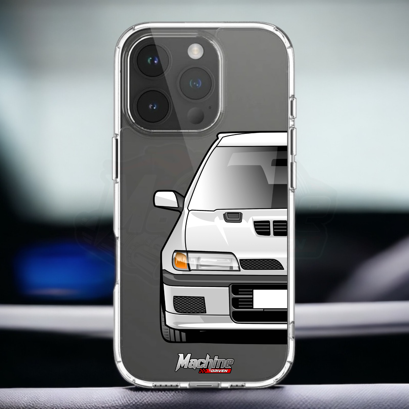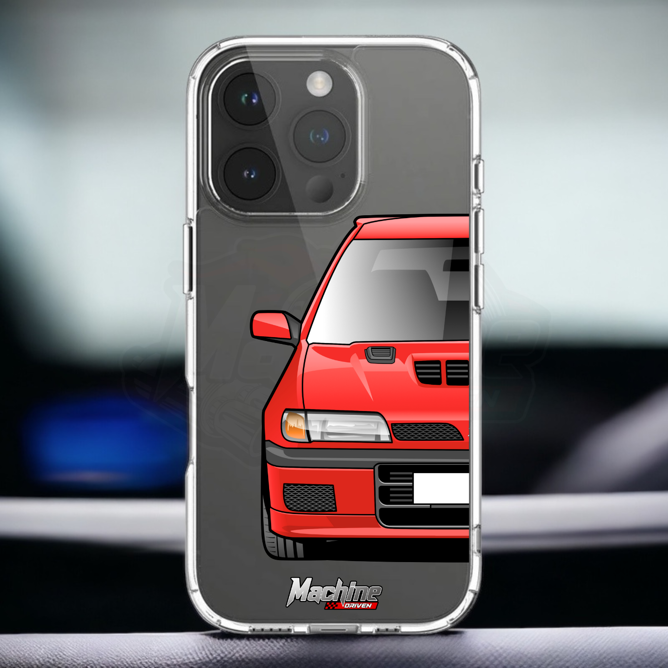 Our phone cases are transparent to show off the original colour of your phone, overlayed with ultra realistic half-image of your car and Machine Driven Logo.