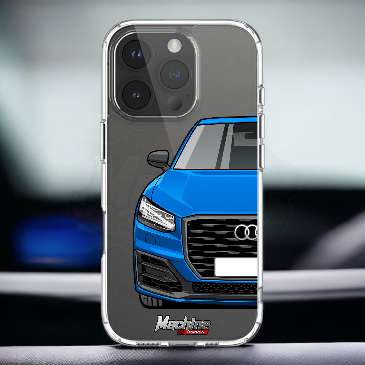 Our phone cases are transparent to show off the original colour of your phone, overlayed with ultra realistic half-image of your car and Machine Driven Logo.