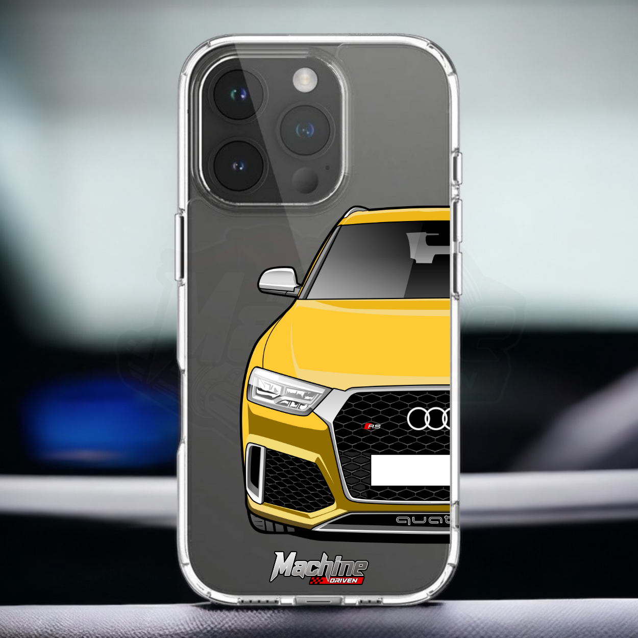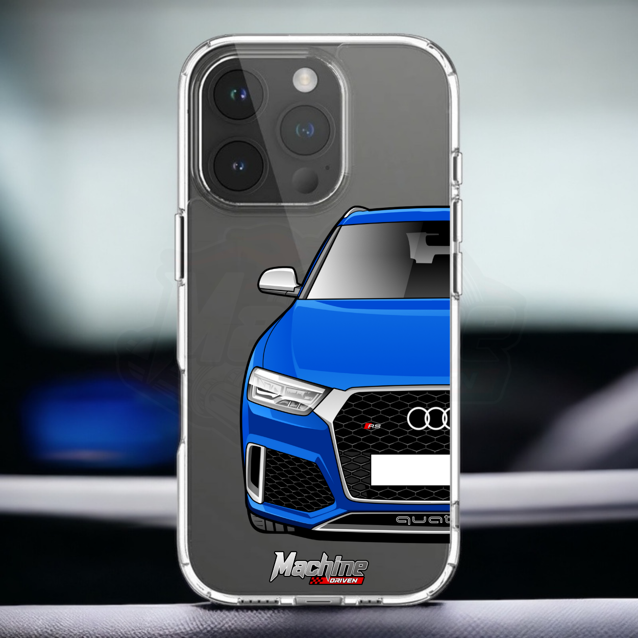 Our phone cases are transparent to show off the original colour of your phone, overlayed with ultra realistic half-image of your car and Machine Driven Logo.