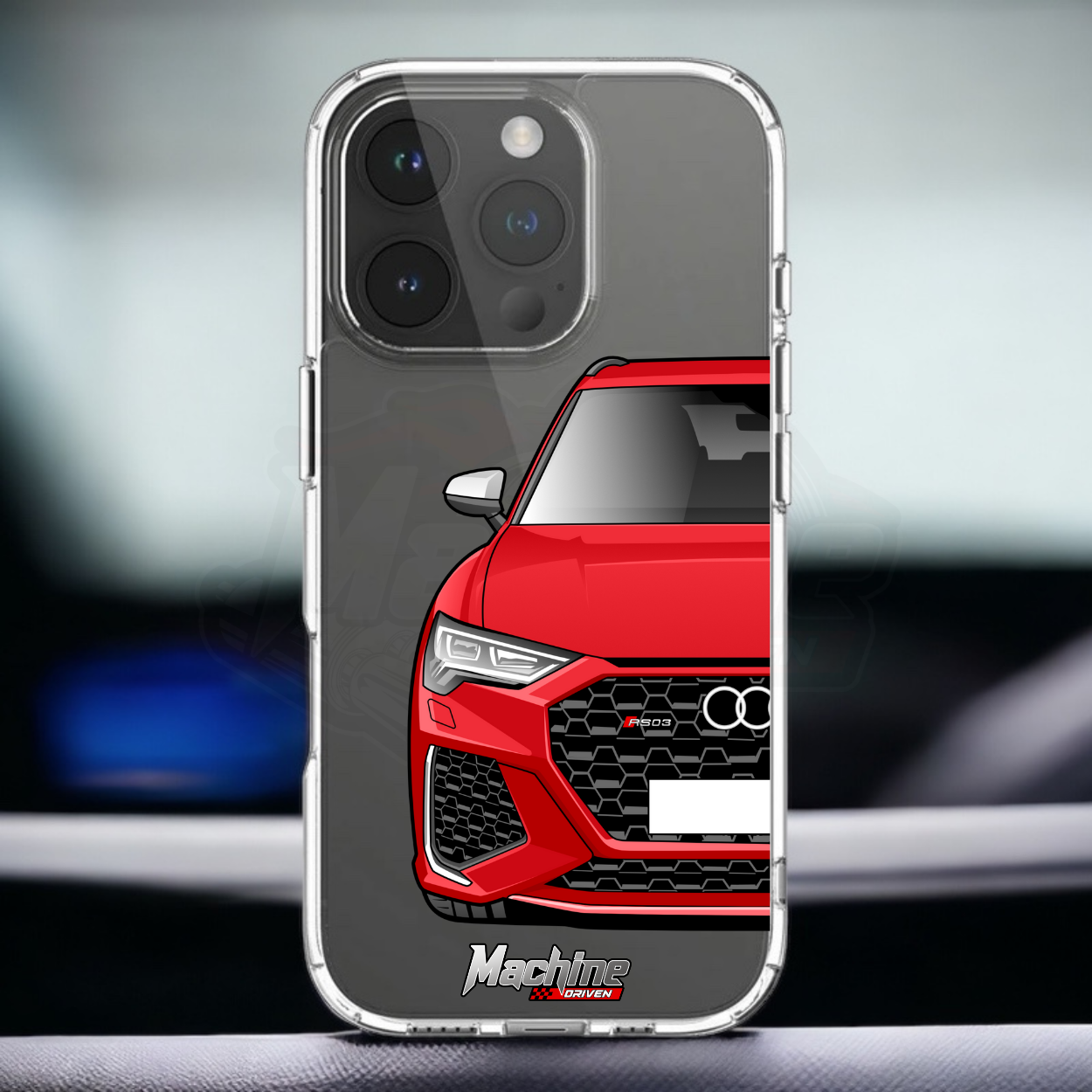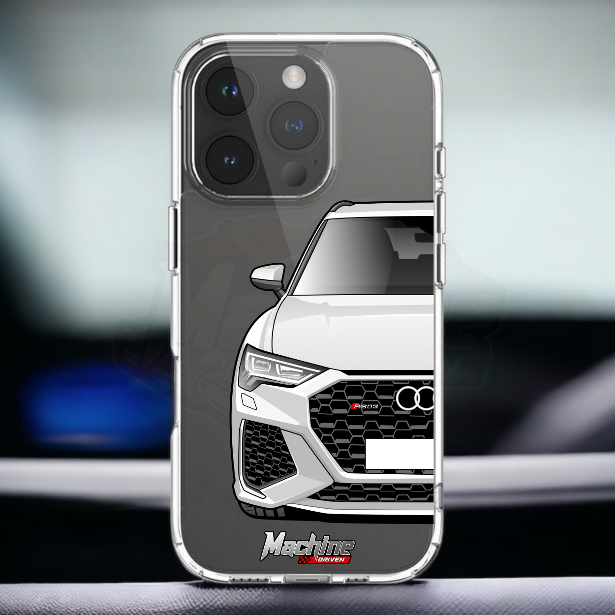 Our phone cases are transparent to show off the original colour of your phone, overlayed with ultra realistic half-image of your car and Machine Driven Logo.