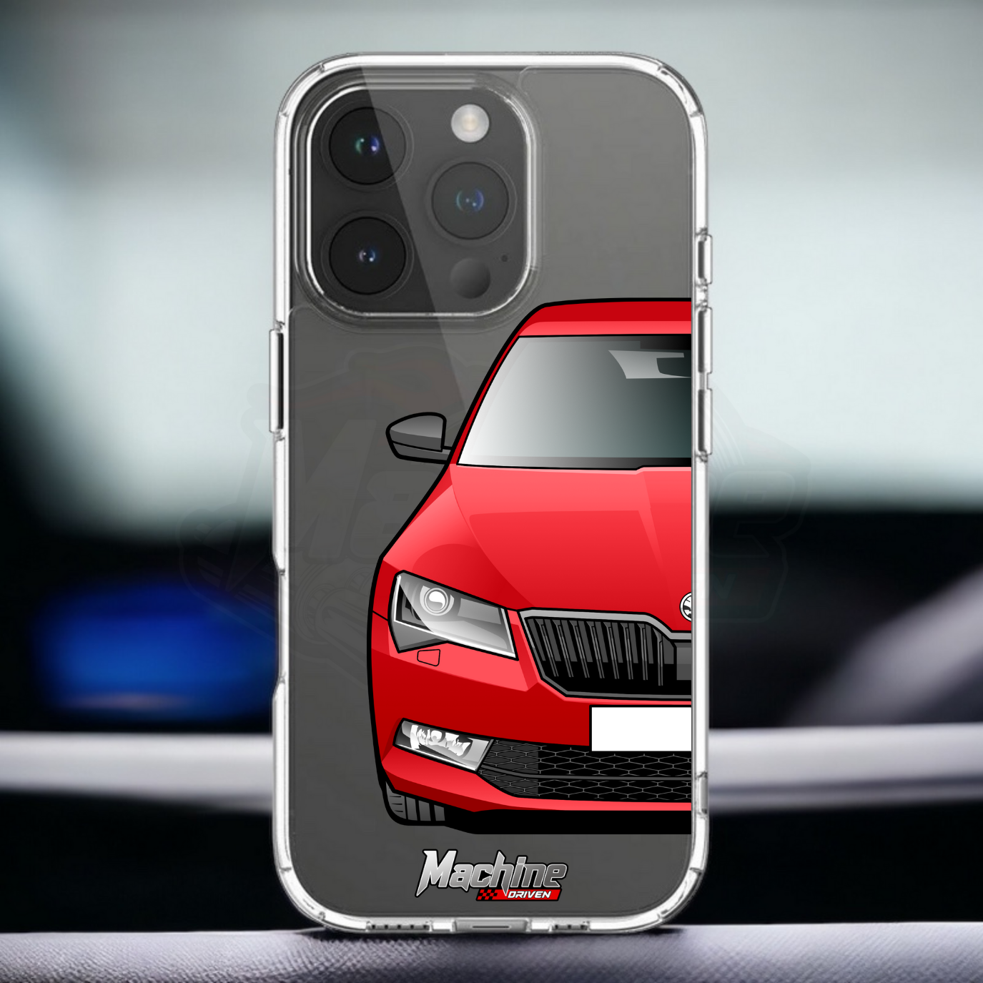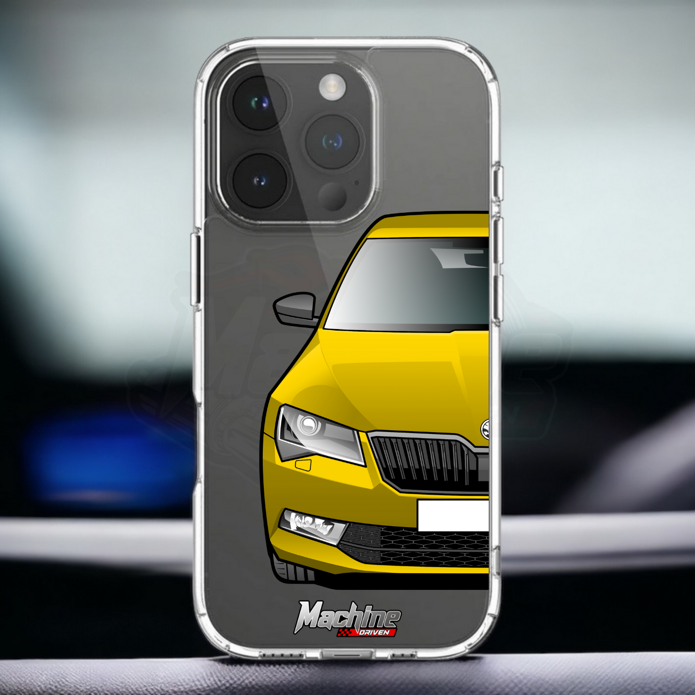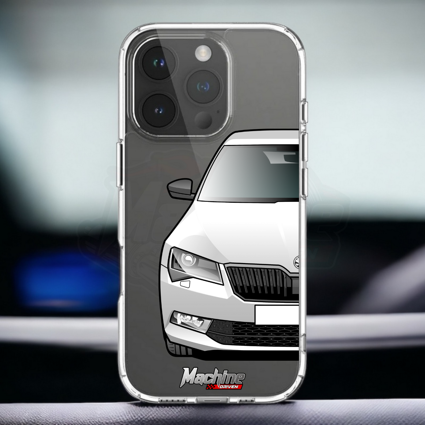 Our phone cases are transparent to show off the original colour of your phone, overlayed with ultra realistic half-image of your car and Machine Driven Logo.
