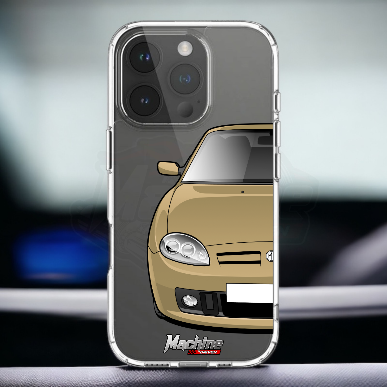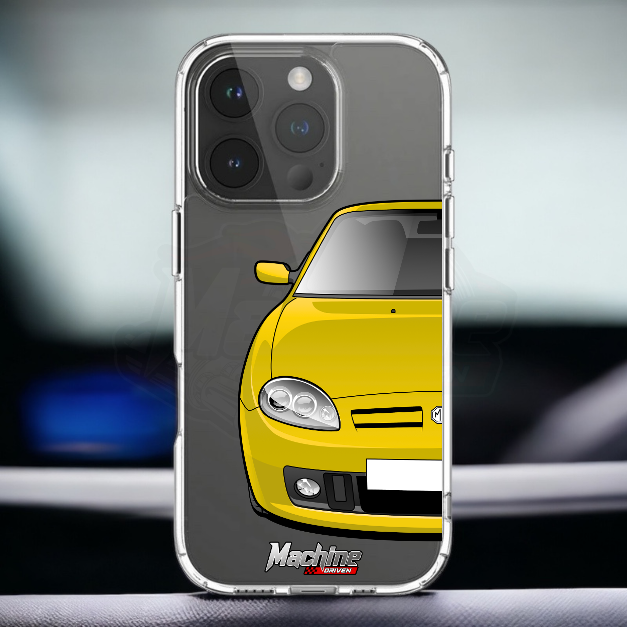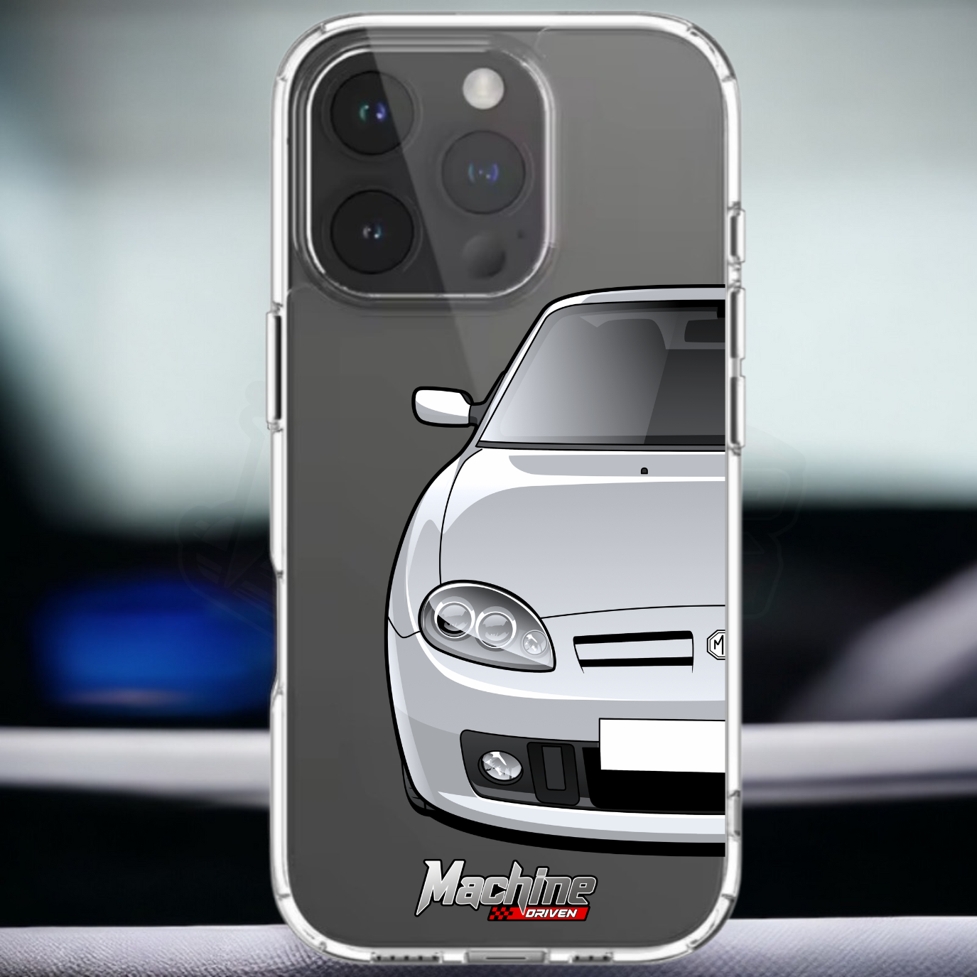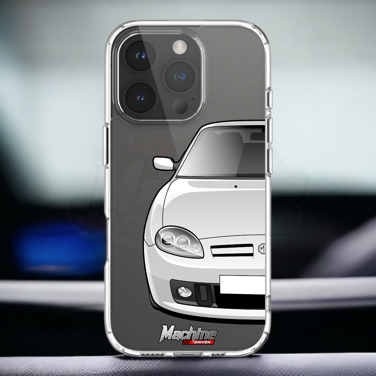 Our phone cases are transparent to show off the original colour of your phone, overlayed with ultra realistic half-image of your car and Machine Driven Logo.