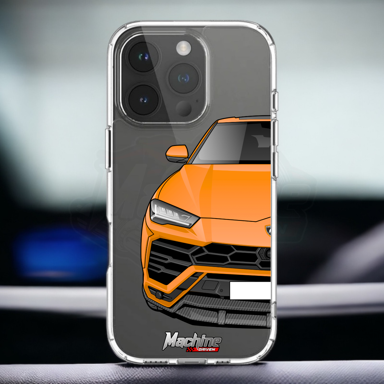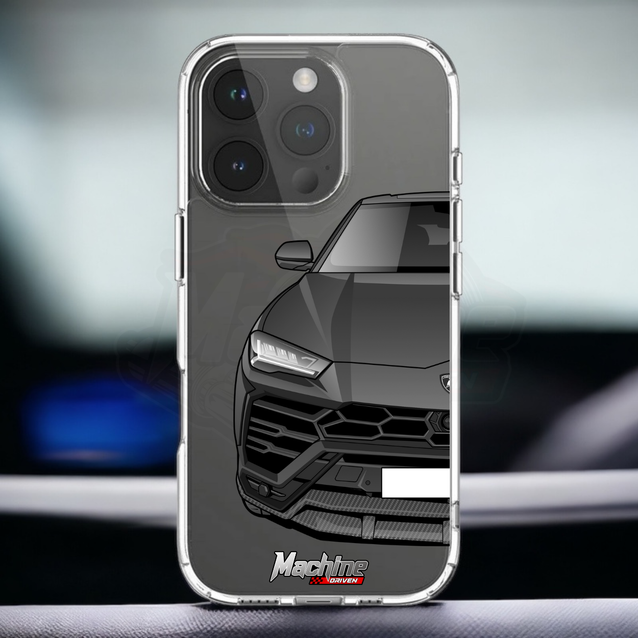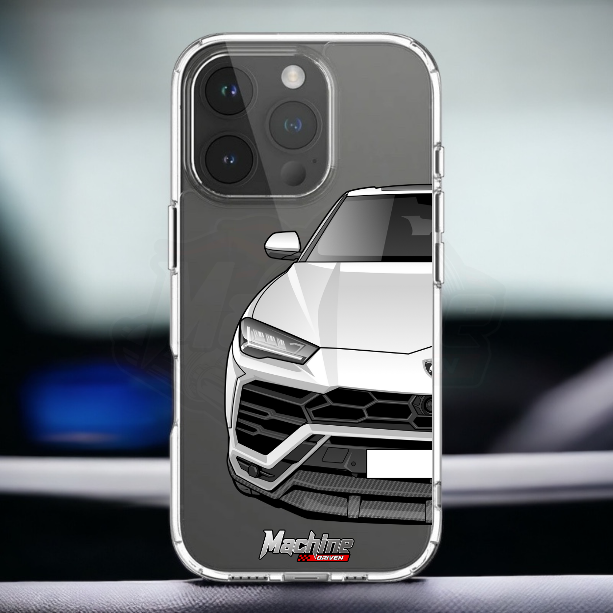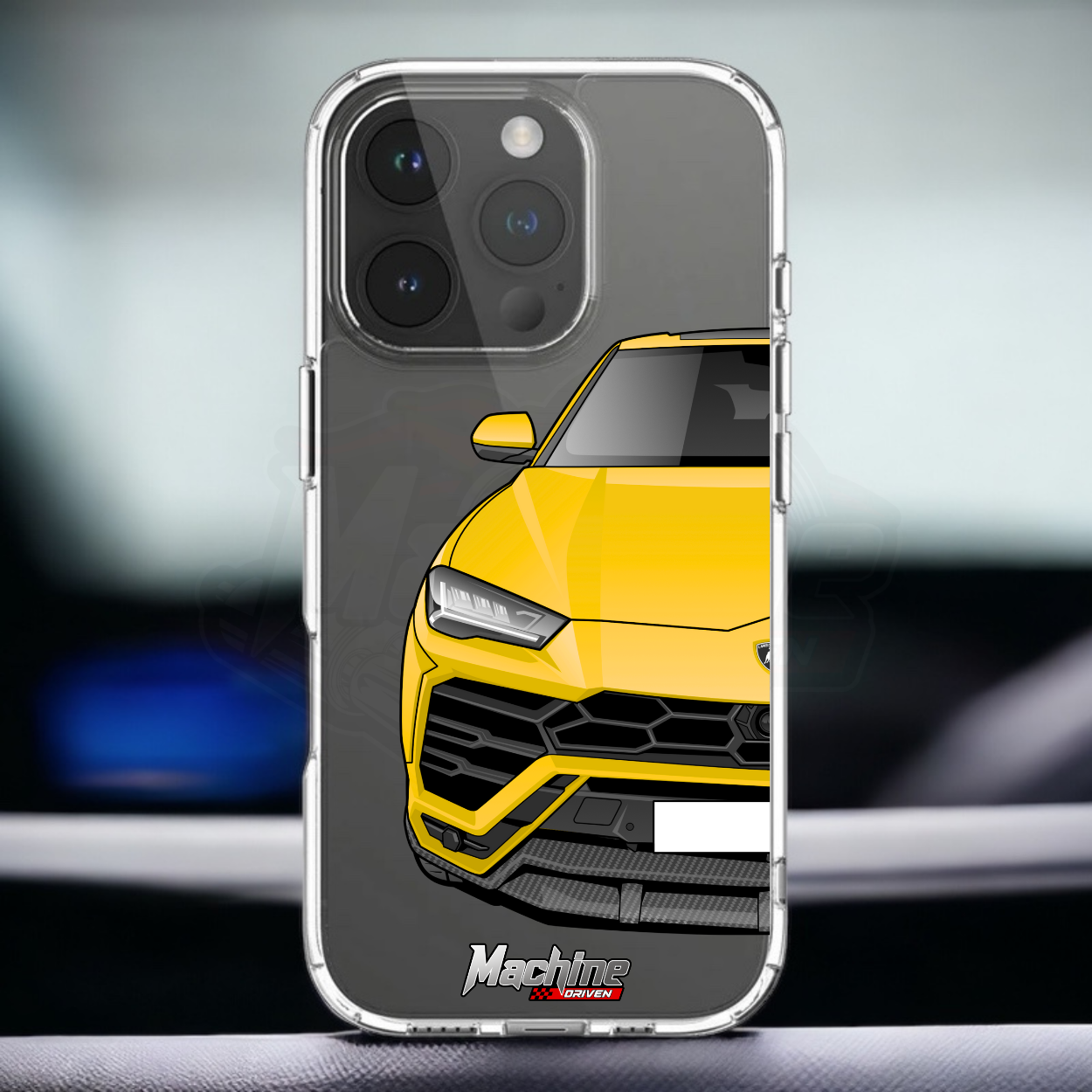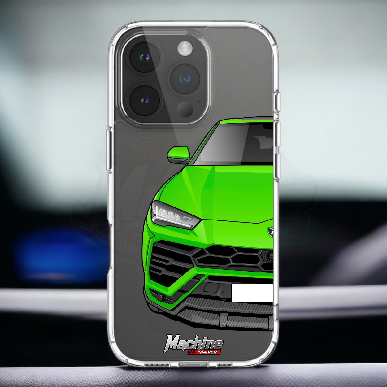 Our phone cases are transparent to show off the original colour of your phone, overlayed with ultra realistic half-image of your car and Machine Driven Logo.